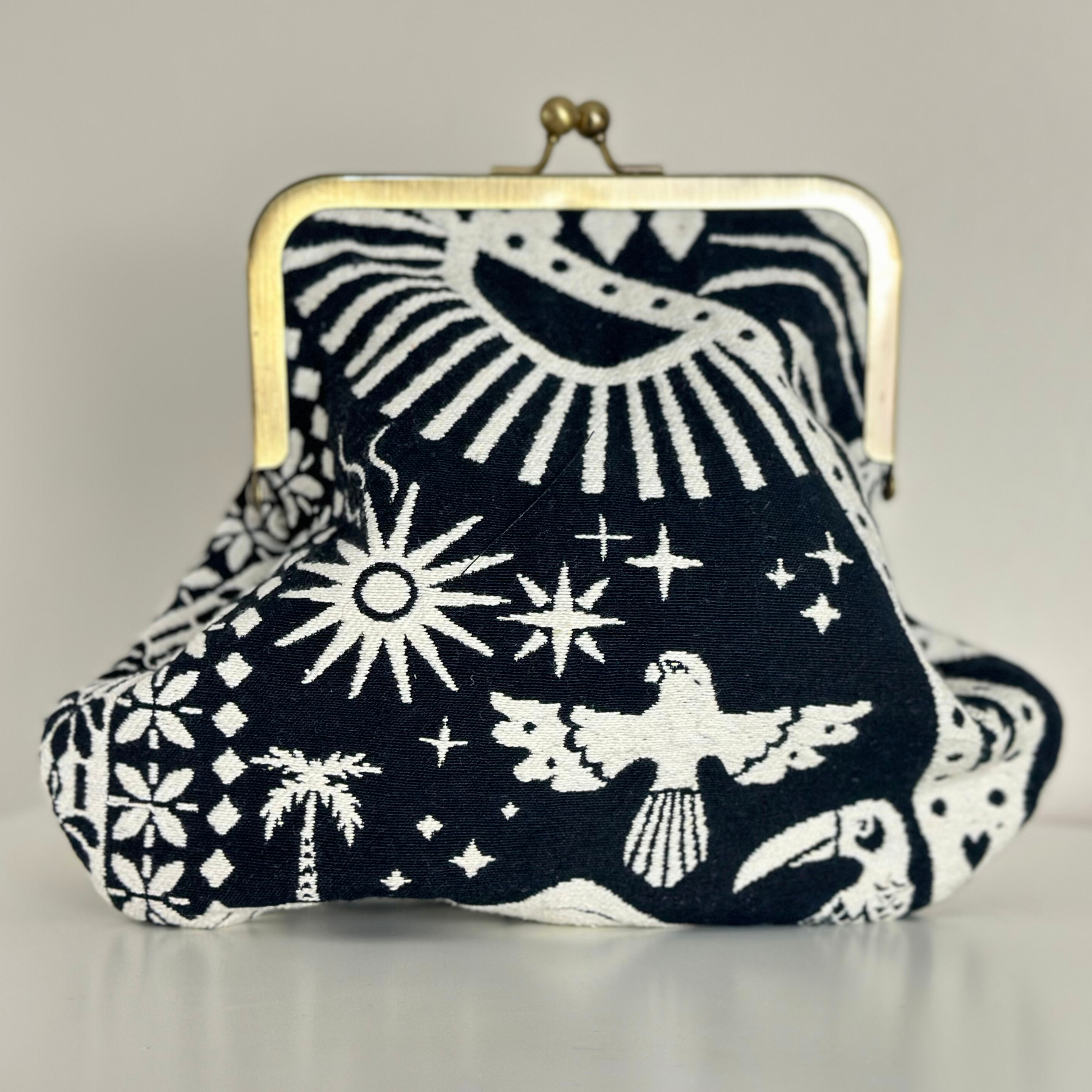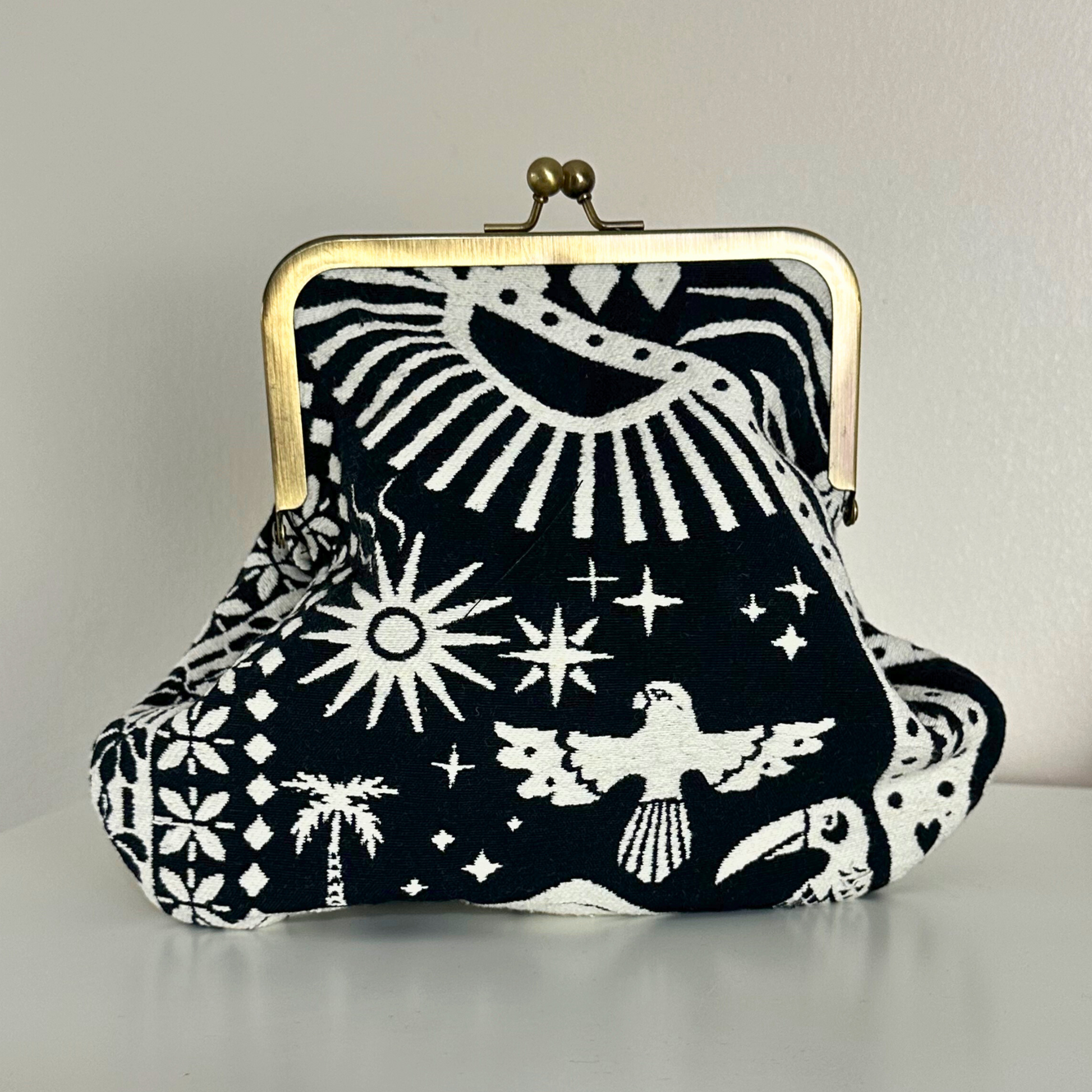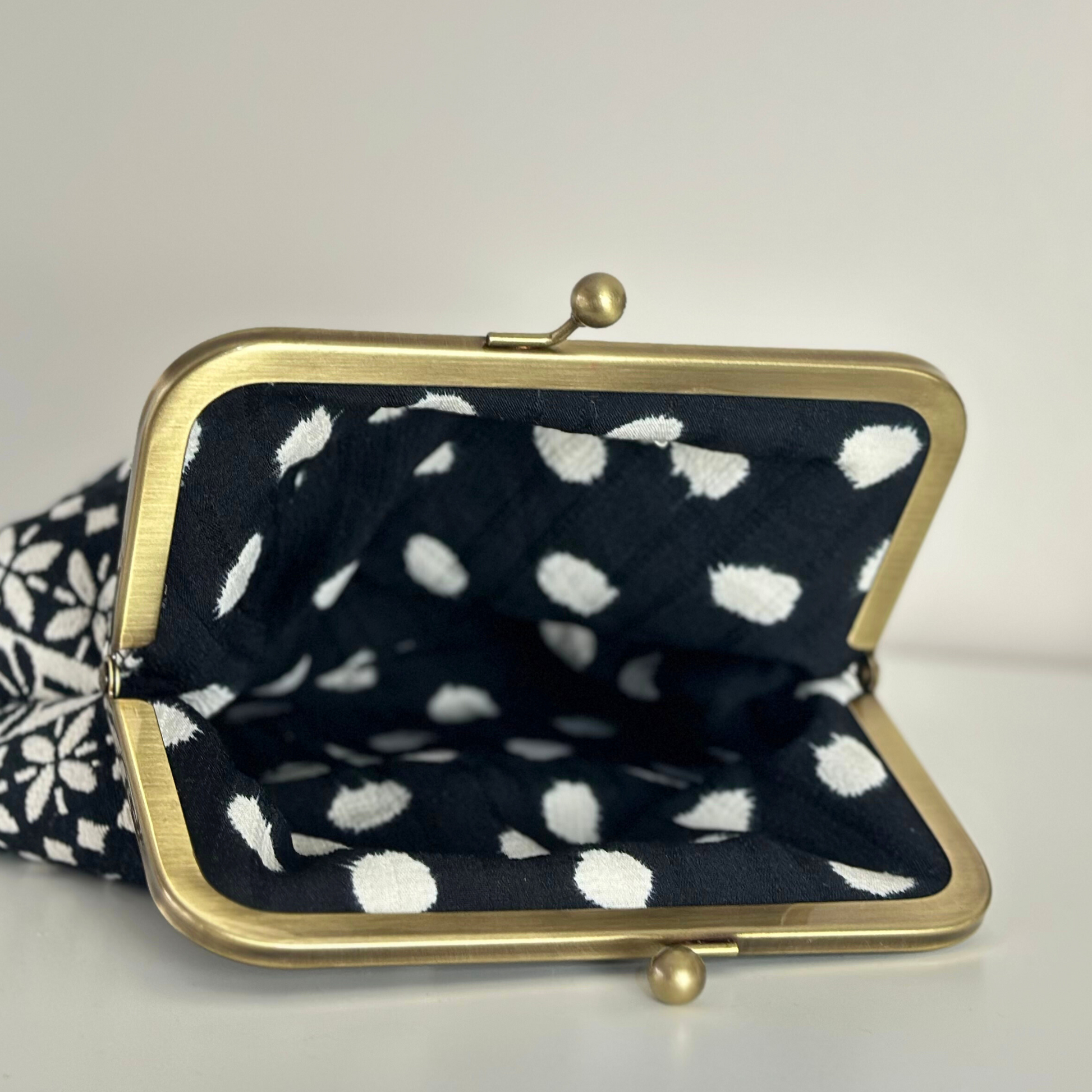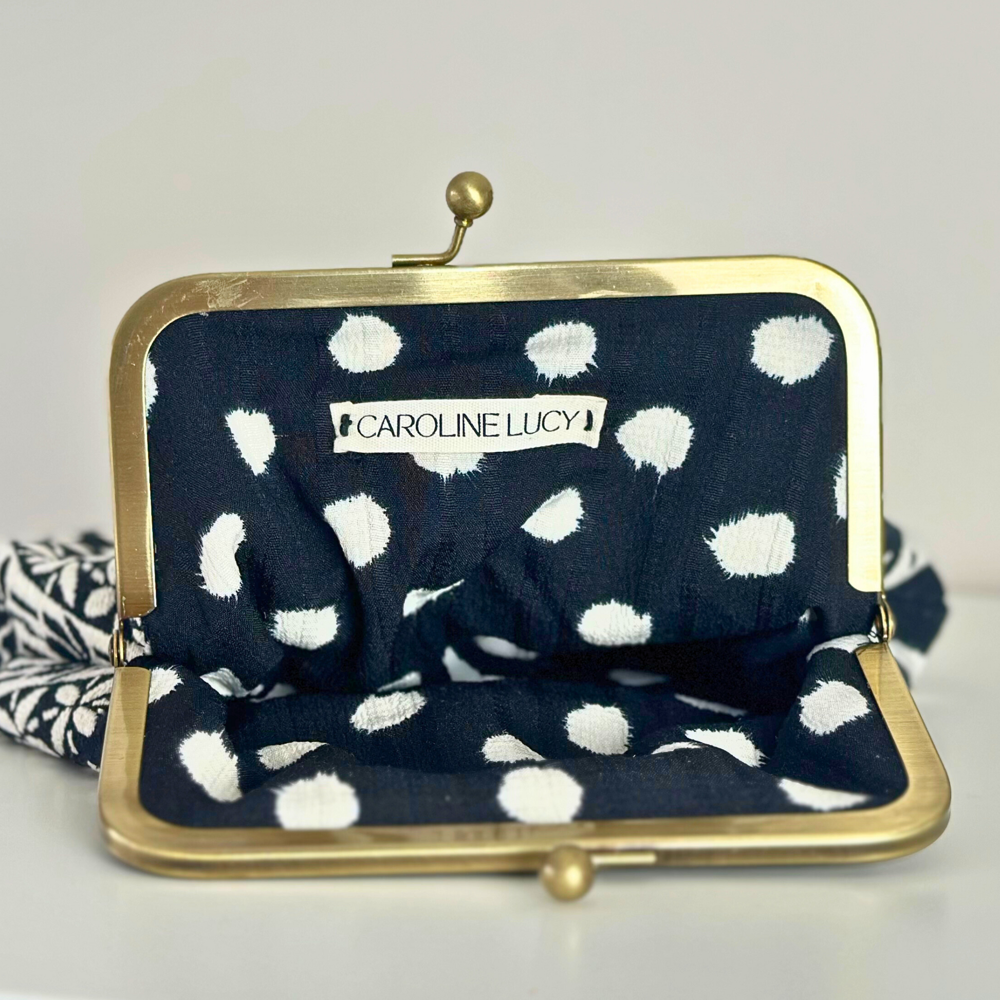 This stunning clutch is crafted from luxurious Paradise Jacquard fabric and lined with a playful polka dot pattern. With its chic design, it’s the perfect accessory to elevate any outfit, adding a touch of elegance and personality.