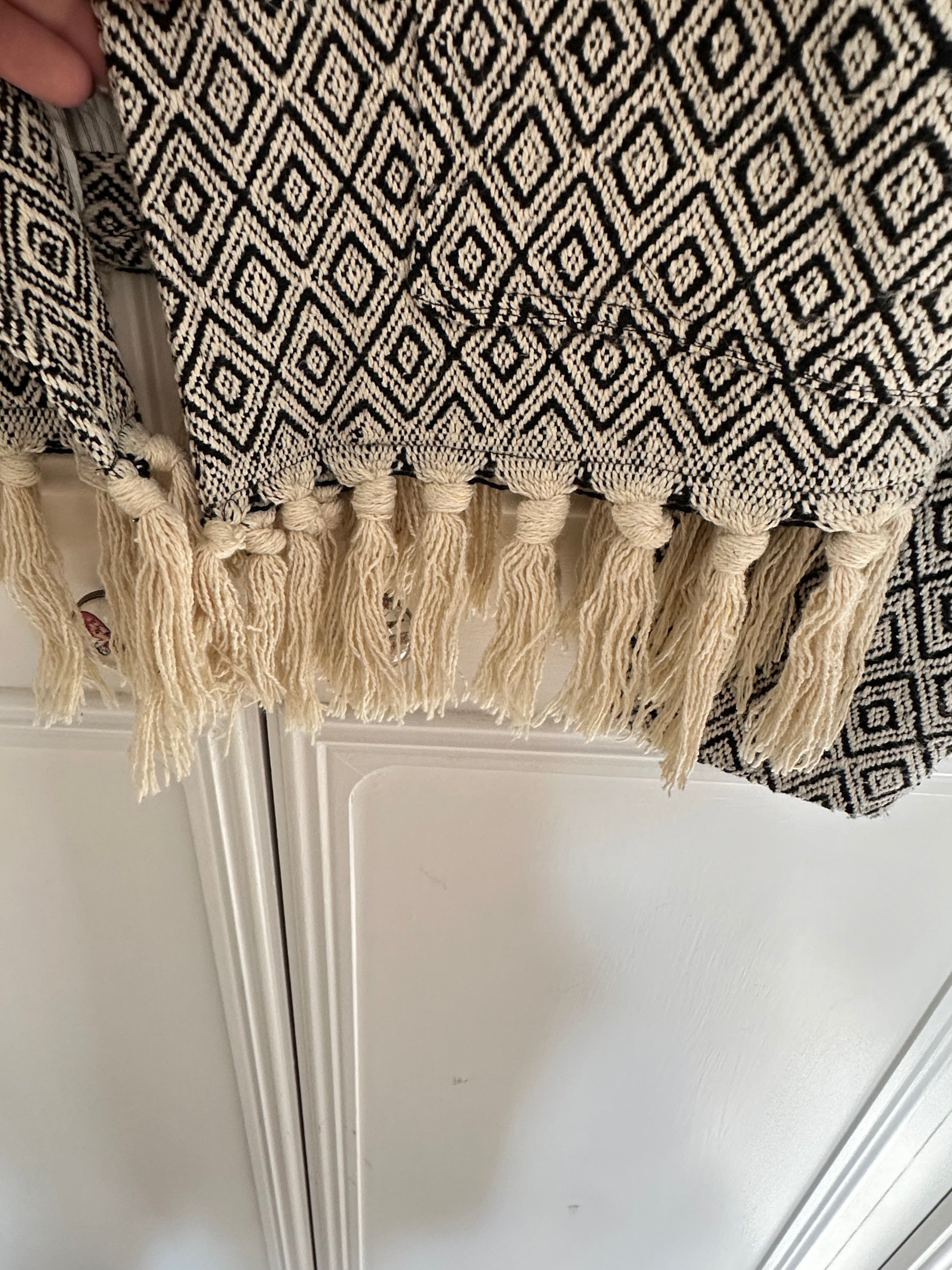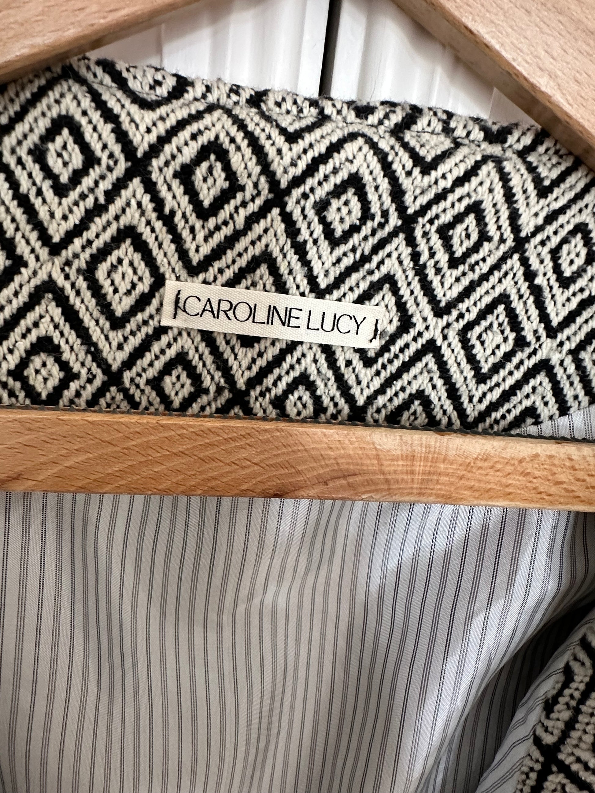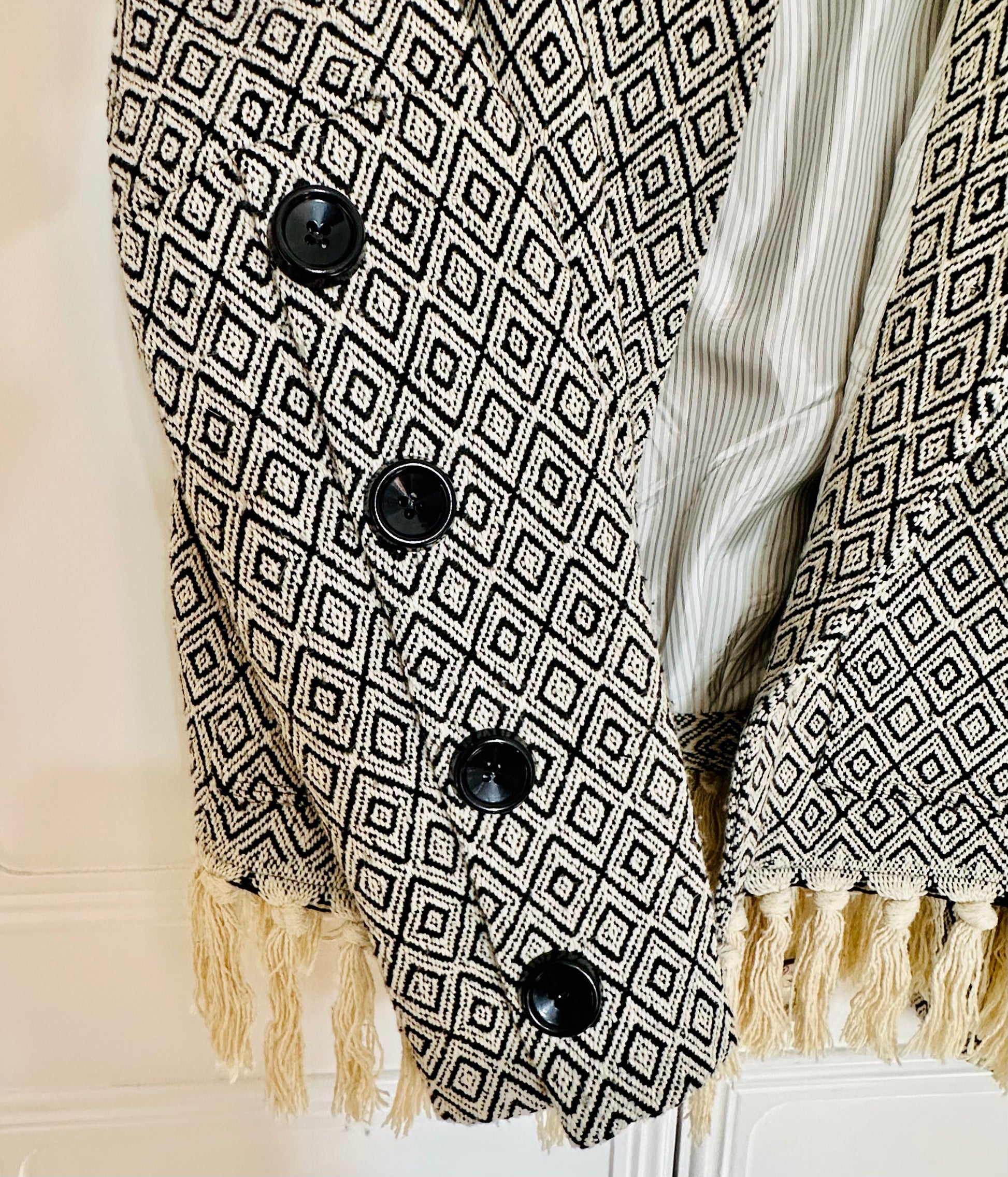 Crafted from a cozy deadstock cotton throw, this beautiful garment showcases a warm, textured fabric that's perfect for the season. The sleeves feature a couture button detail and a tasselled hem, while two functional pockets add both style and practicality to this unique piece.