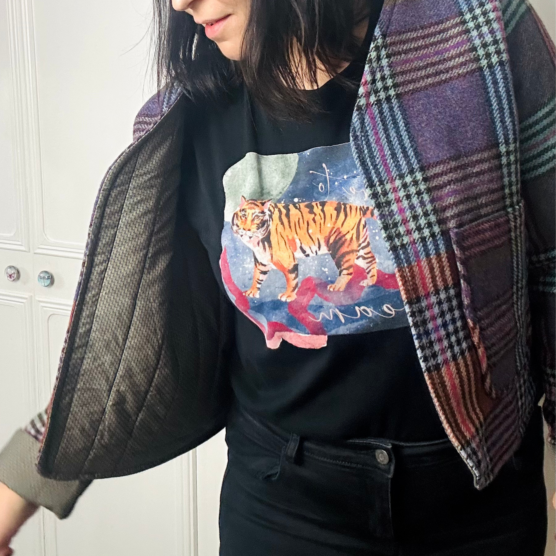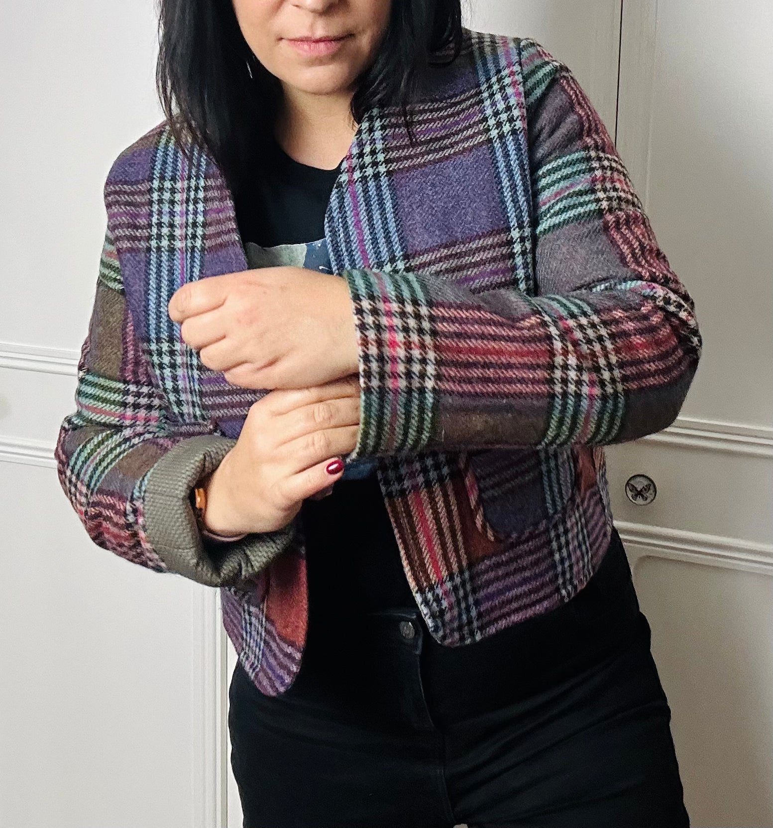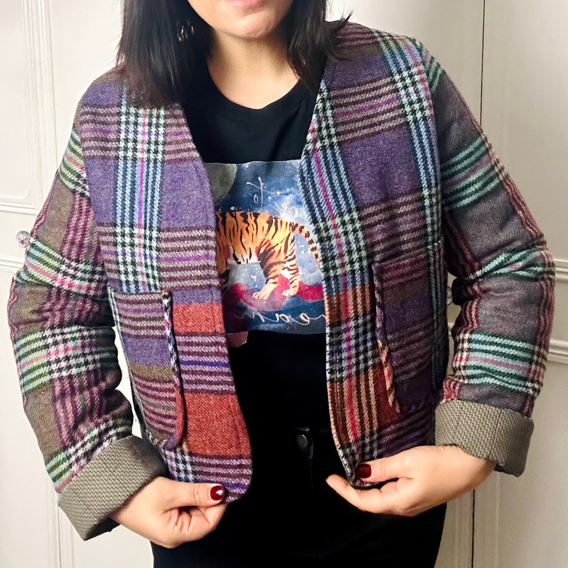 This unique, up-cycled cropped jacket is crafted from a beautiful Irish wool blanket, combining sustainability with timeless style. Lined in quilted cotton for extra warmth, it features an open-front design, two front pockets, and adjustable cuffs that can be worn rolled up or down.