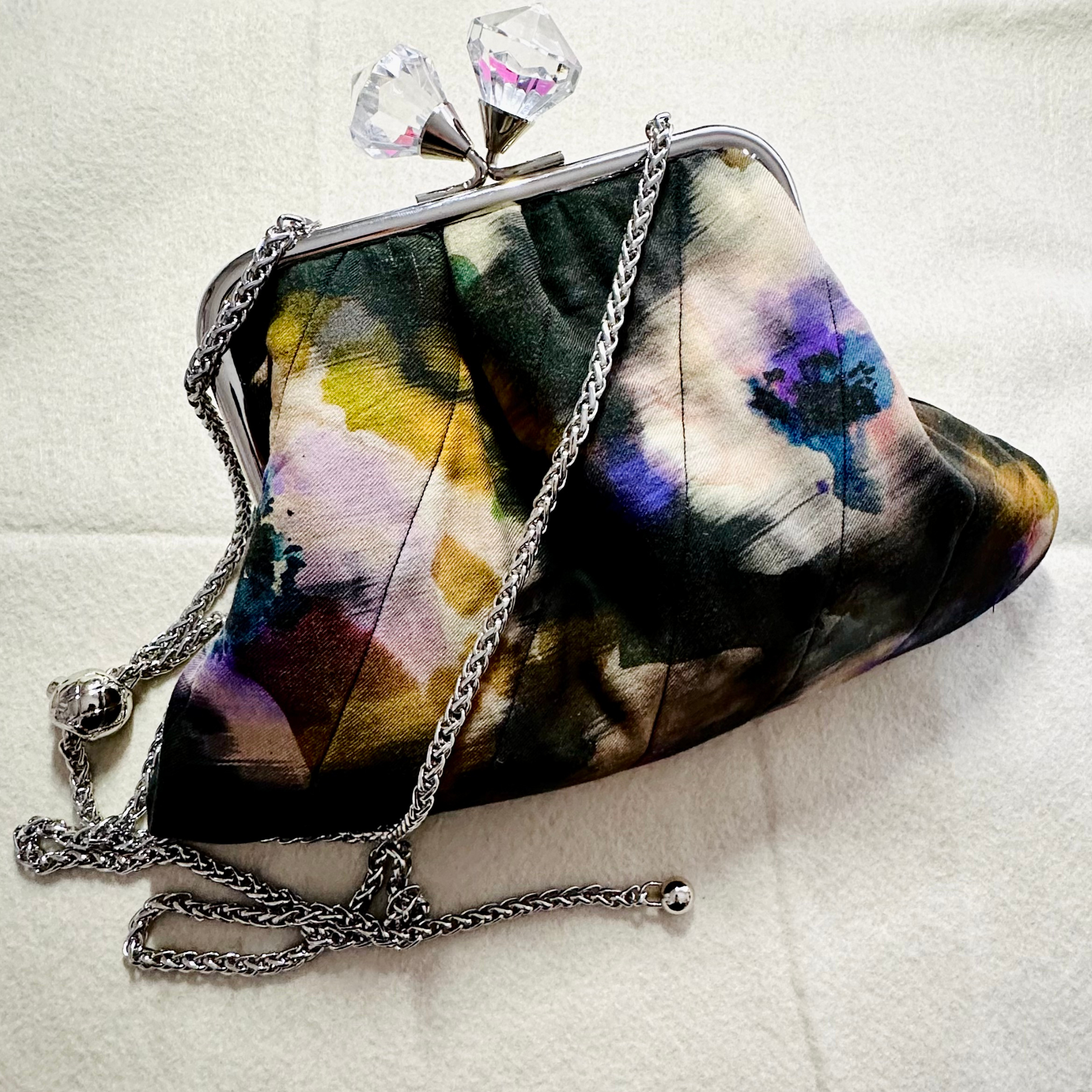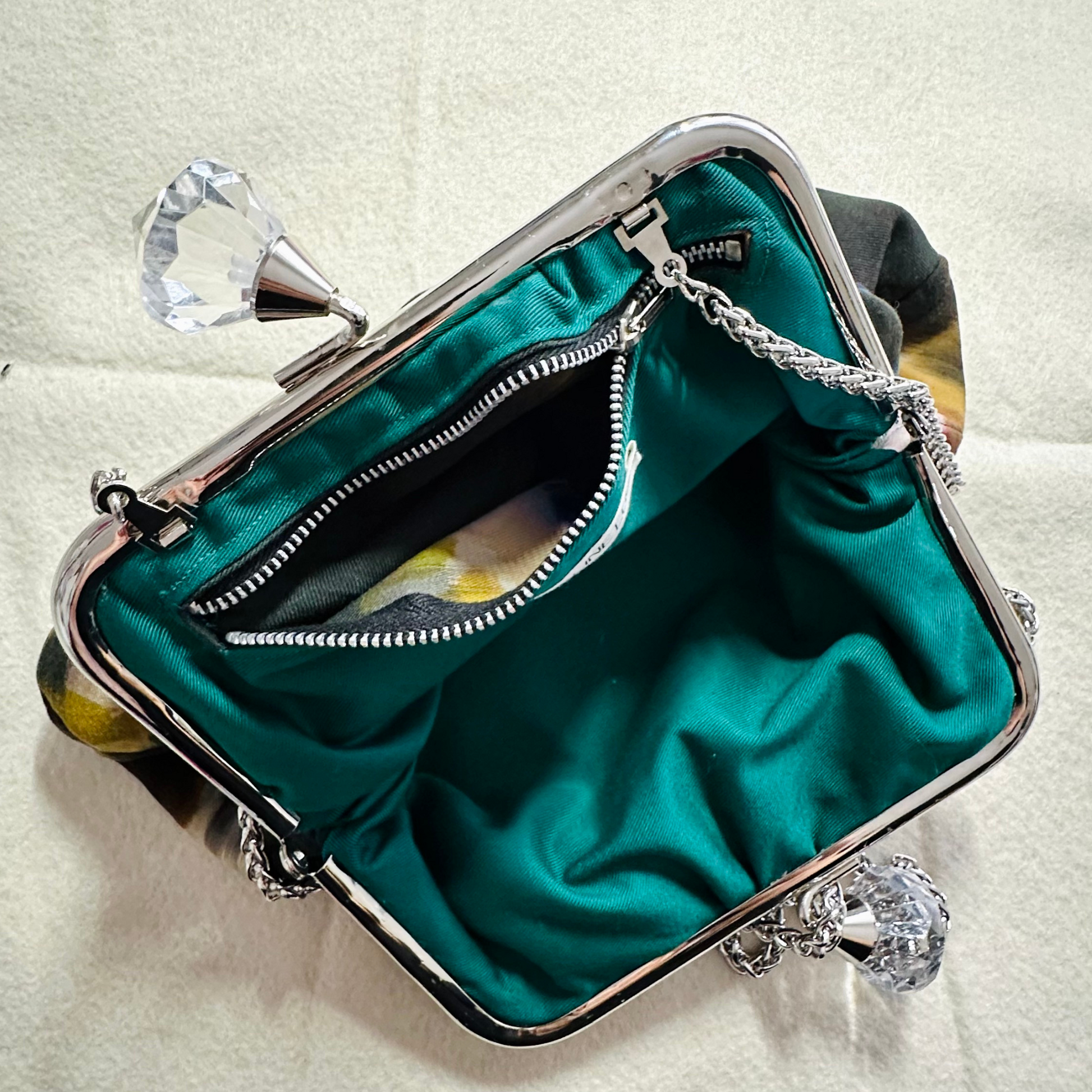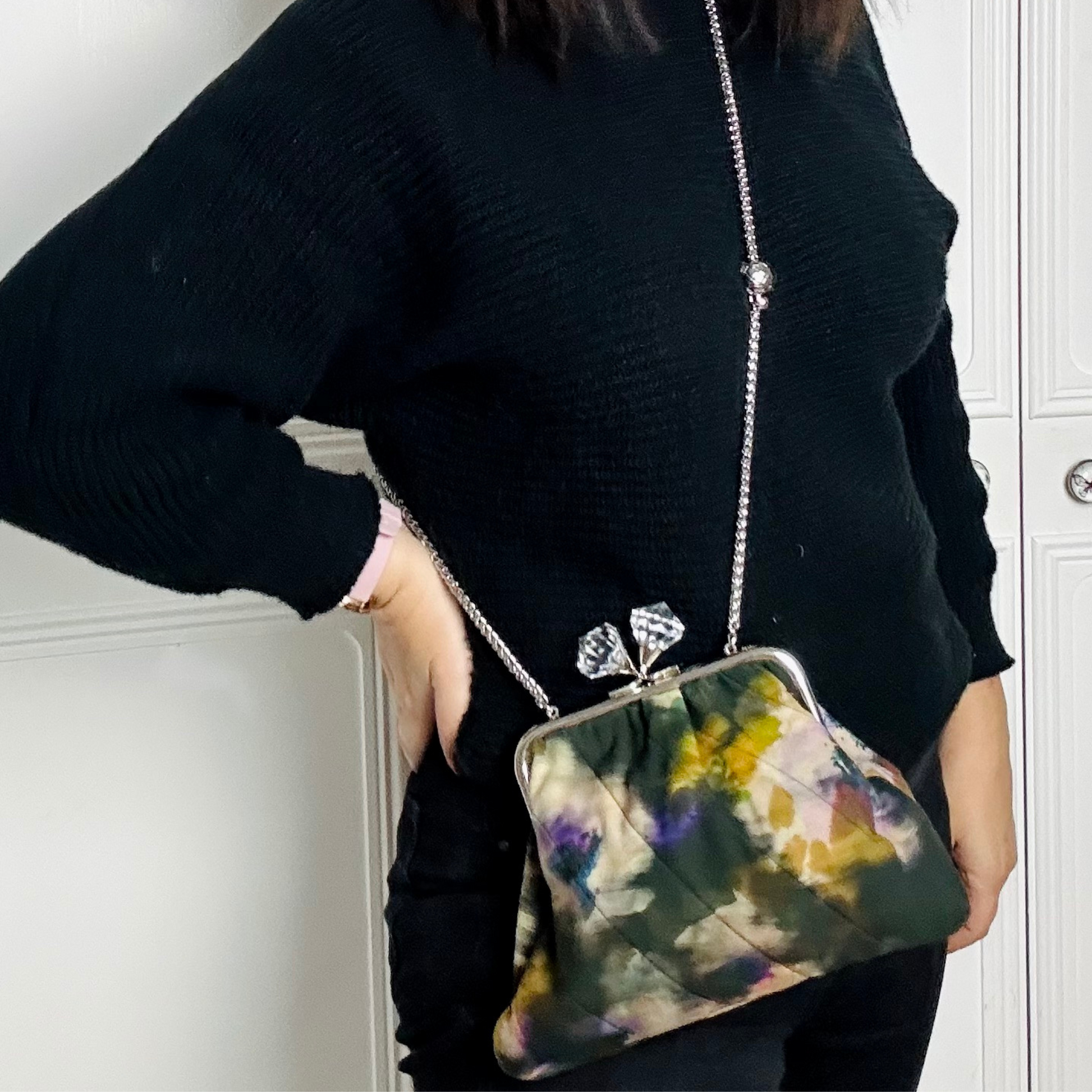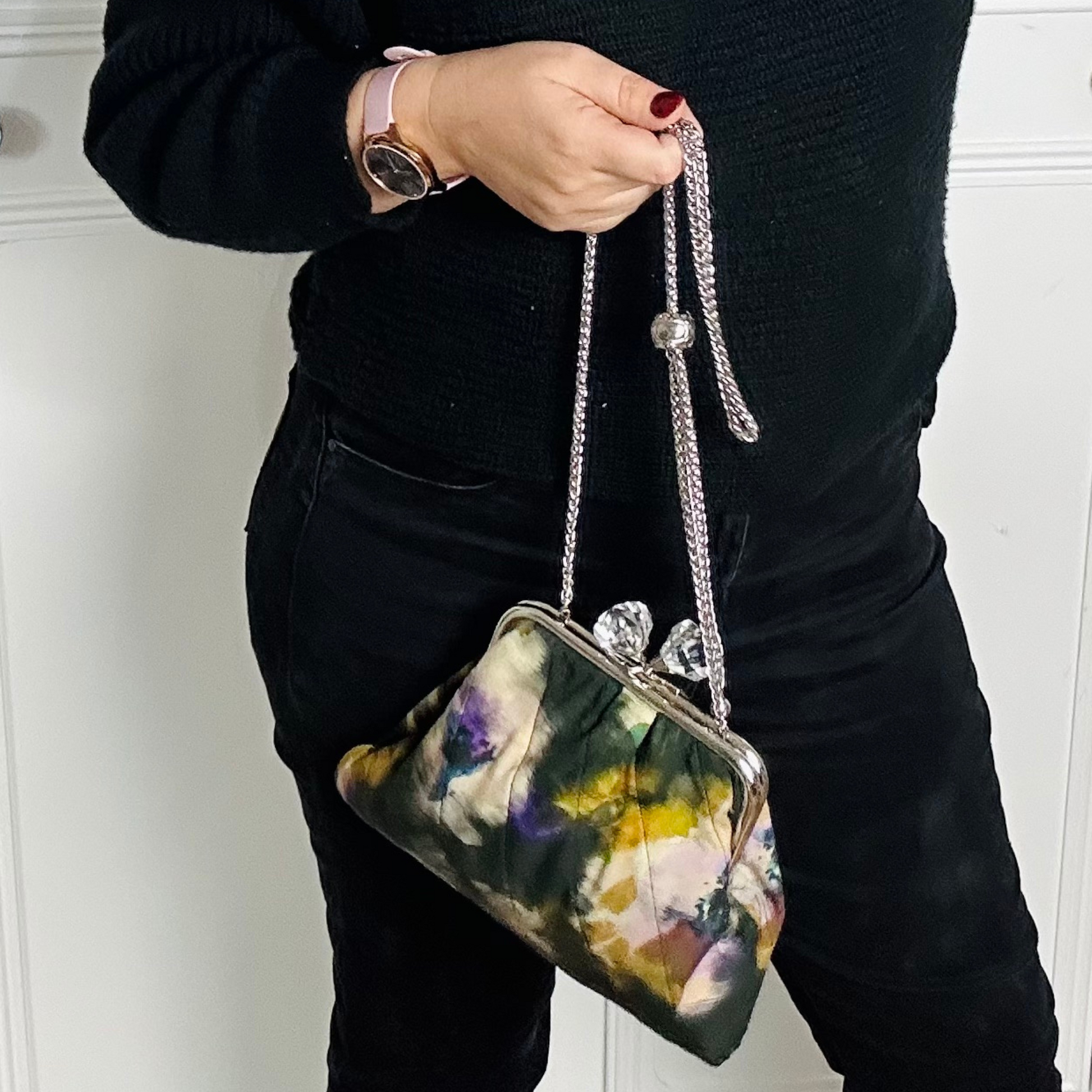This one-of-a-kind clutch is crafted from luxurious deadstock Italian silk, giving new life to beautiful, unused materials. The vintage clasp, saved from two decades ago, adds a timeless touch, while the lining—rich green canvas from a theatre production of Into the Woods—adds a story of its own.
